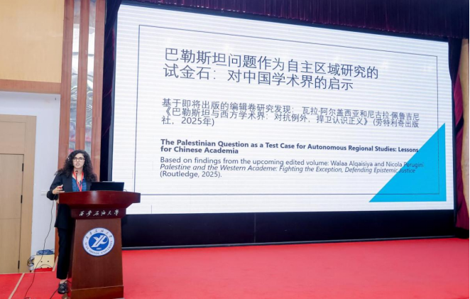 西北大學(xué)中東研究所Walaa Alqaisiya博士作題為《The Palestinian Exception in Western Academia:Implications for Chinese Region and Country Studies 》的主旨報告,通過揭示知識生產(chǎn)體系如何被帝國主義利益結(jié)構(gòu)性侵蝕的重要標(biāo)尺,剖析了西方學(xué)術(shù)界在巴勒斯坦問題研究中的系統(tǒng)性缺陷,探討這些經(jīng)驗對構(gòu)建中國區(qū)域與國家研究自主框架的啟示。