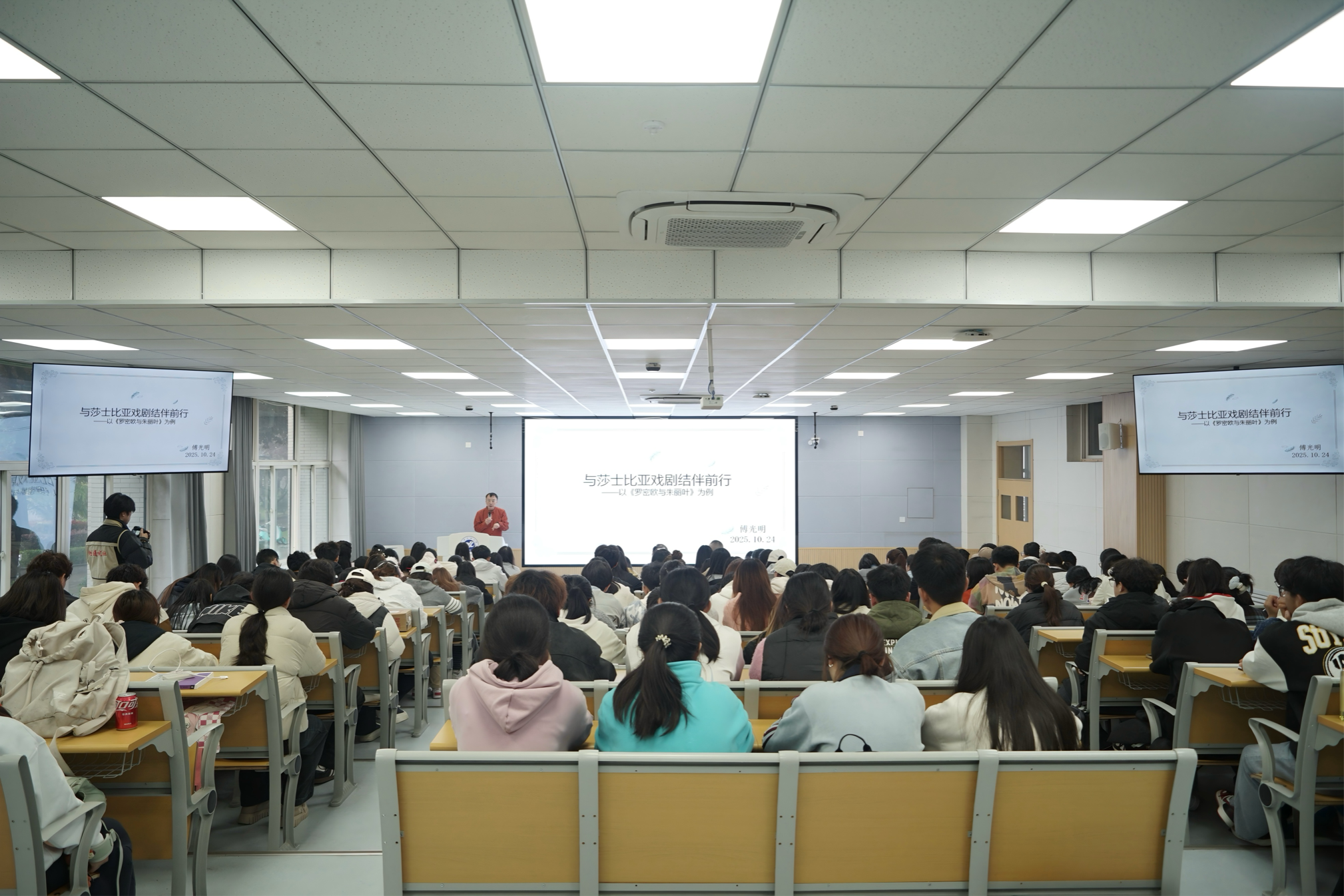 傅光明教授以其深厚的學(xué)術(shù)功底和詼諧幽默的語言風(fēng)格,引領(lǐng)同學(xué)們步入莎士比亞戲劇的瑰麗殿堂。在講解《哈姆雷特》時(shí),他通過對比“To be, or not to be”這一經(jīng)典獨(dú)白的不同譯本,深入剖析了譯者如何理解與傳遞莎翁筆下的終極哲思;而當(dāng)聚焦《羅密歐與朱麗葉》,他又將目光投向詩意盎然的對白轉(zhuǎn)譯,生動(dòng)詮釋了這段愛情傳奇在跨越語言屏障時(shí)所迸發(fā)的藝術(shù)張力。他深情回顧了自己與莎士比亞戲劇數(shù)十載的“結(jié)伴”之旅,分享了如何通過細(xì)讀文本、比對版本、考據(jù)歷史,逐步深入這座文學(xué)寶庫。他鼓勵(lì)青年學(xué)子在求知的道路上,永葆恒心、錘煉匠心、堅(jiān)守對真理的赤誠之心。