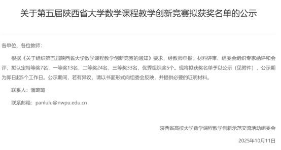 近日,第五屆陜西省大學(xué)數(shù)學(xué)課程教學(xué)創(chuàng)新競賽獲獎結(jié)果公布,我校理學(xué)院青年教師陳思博士在競賽中喜獲一等獎。