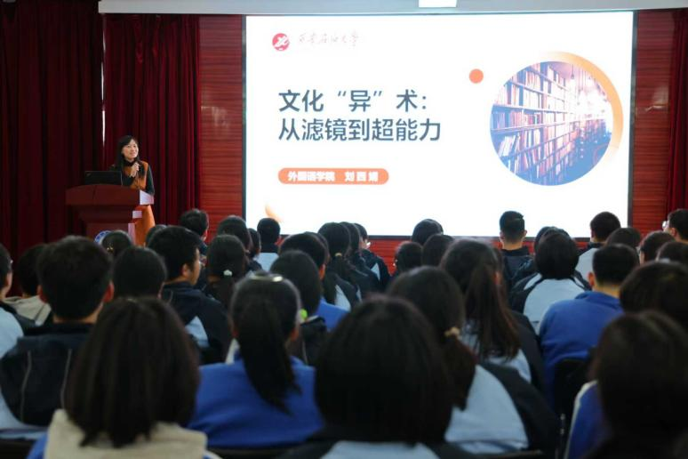 劉西娟老師為學(xué)生們作了題為《文化“異”術(shù):從濾鏡到超能力》的專題講座。她從文化意識的培養(yǎng)出發(fā),引導(dǎo)學(xué)生打破刻板印象,以多元視角理解世界,深入分析不同文化背景下的思維差異。