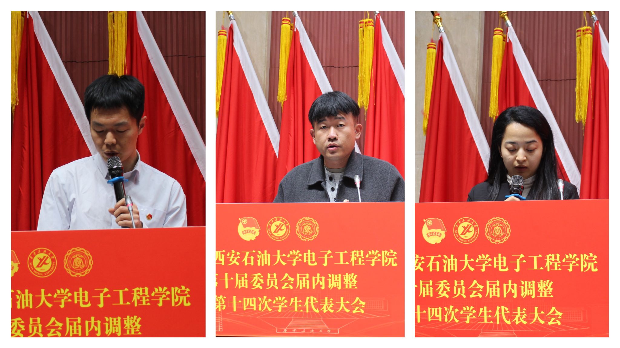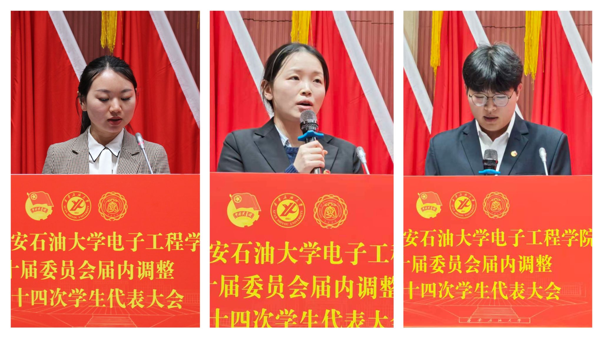 2023級團(tuán)總支書記張欣樂宣讀《共青團(tuán)西安石油大學(xué)電子工程學(xué)院第十屆委員會增補(bǔ)委員調(diào)整名單》,2022級團(tuán)總支書記張零宣讀《大會選舉辦法》,2024級團(tuán)總支書記帕麗達(dá)·托乎提宣讀《大會監(jiān)票人、計票人名單》。