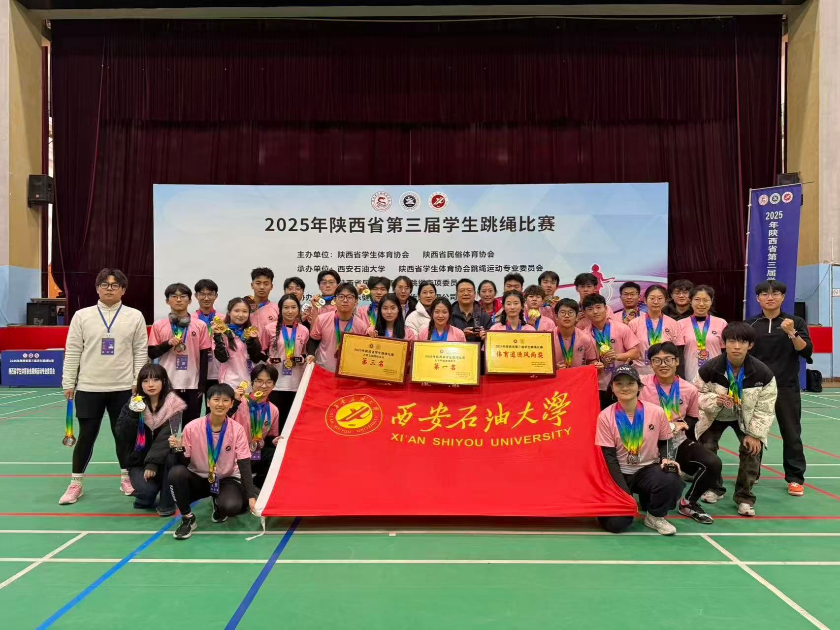 我校選派31名學(xué)生運(yùn)動(dòng)員參加。體育學(xué)院黨總支書記劉小波、院長李壽邦擔(dān)任領(lǐng)隊(duì),徐小仙、董晨和原文惠擔(dān)任教練,主場作戰(zhàn)的跳繩隊(duì)展現(xiàn)出昂揚(yáng)的斗志與精湛的技藝,在眾多參賽隊(duì)伍中脫穎而出,甲組4個(gè)項(xiàng)目取得金牌,10個(gè)項(xiàng)目取得銀牌,9個(gè)項(xiàng)目取得銅牌,最終榮獲甲組團(tuán)體總分第一名;乙組5個(gè)項(xiàng)目取得金牌,3個(gè)項(xiàng)目取得銀牌,4個(gè)項(xiàng)目取得銅牌,最終榮獲團(tuán)體總分第三名的優(yōu)異成績。徐小仙參加園丁組的30秒并腳跳和30秒交換跳均取得冠軍。同時(shí),西安石油大學(xué)還被評(píng)為體育道德風(fēng)尚獎(jiǎng),為學(xué)校贏得了榮譽(yù)。