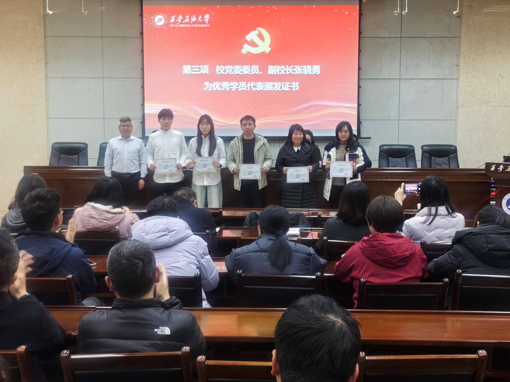 2025年12月24日下午,管道工程學(xué)院黨委在雁塔校區(qū)西階第三會(huì)議室開(kāi)展“學(xué)黨章鑄忠誠(chéng),悟思想強(qiáng)使命”專題學(xué)習(xí)班第四講暨結(jié)業(yè)儀式。校黨委委員、副校長(zhǎng)張驍勇出席并作第四講專題報(bào)告,學(xué)院班子全體成員、全體教工黨員、研究生黨員代表70人參加儀式。儀式由學(xué)院黨委副書記高亮主持。