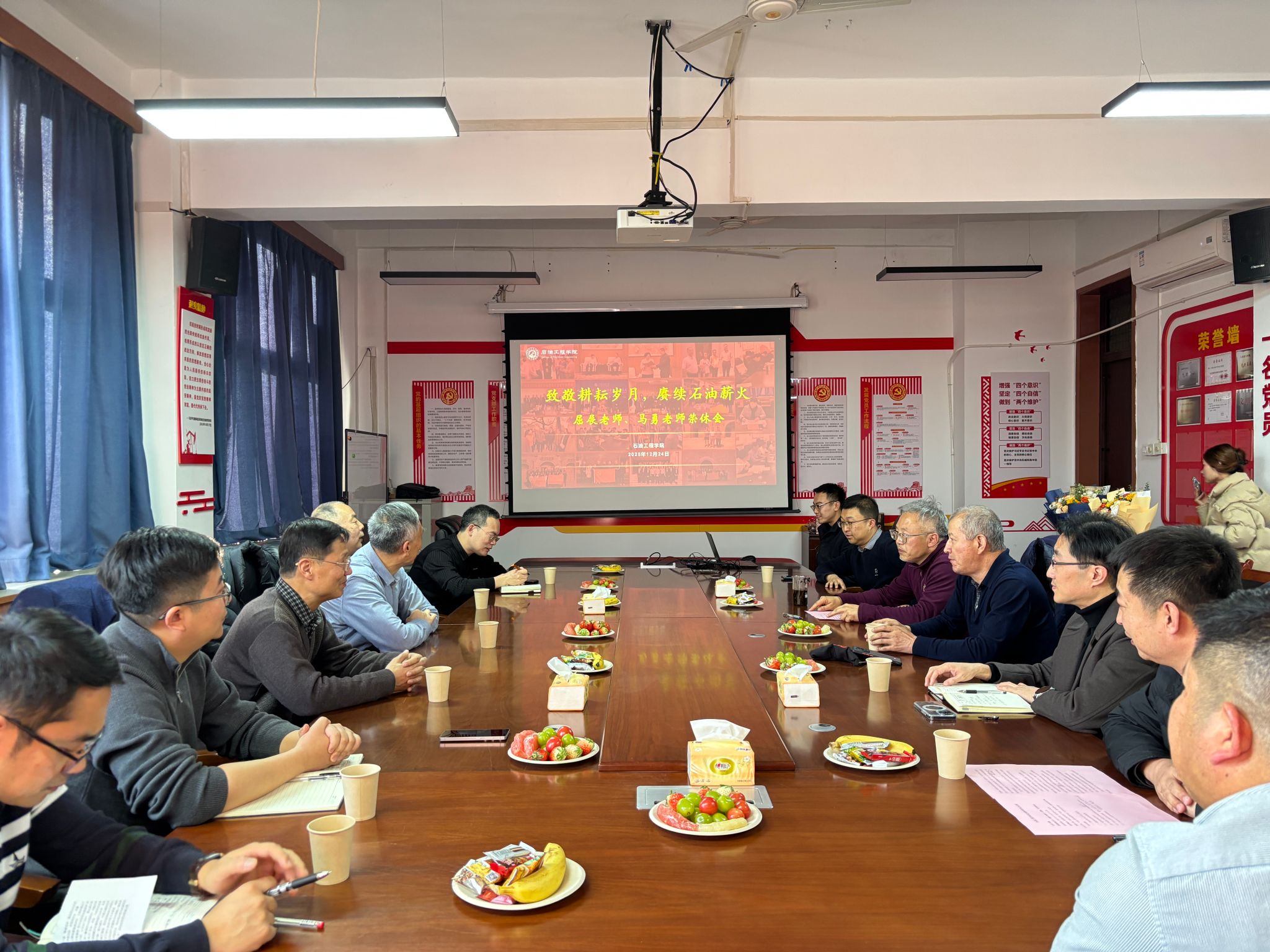 歲月如歌,薪火相傳。12月24日下午,石油工程學(xué)院雁塔校區(qū)第一教學(xué)樓603會(huì)議室隆重舉行“致敬耕耘歲月,賡續(xù)石油薪火”主題榮休會(huì),深情歡送屈展、馬勇兩位榮退教師。學(xué)院班子成員、退休教師代表、兩位老師往屆所帶學(xué)生和原任辦公室同事、學(xué)院教師代表齊聚一堂,共憶執(zhí)教歲月,共話師恩情誼,共送美好祝福。