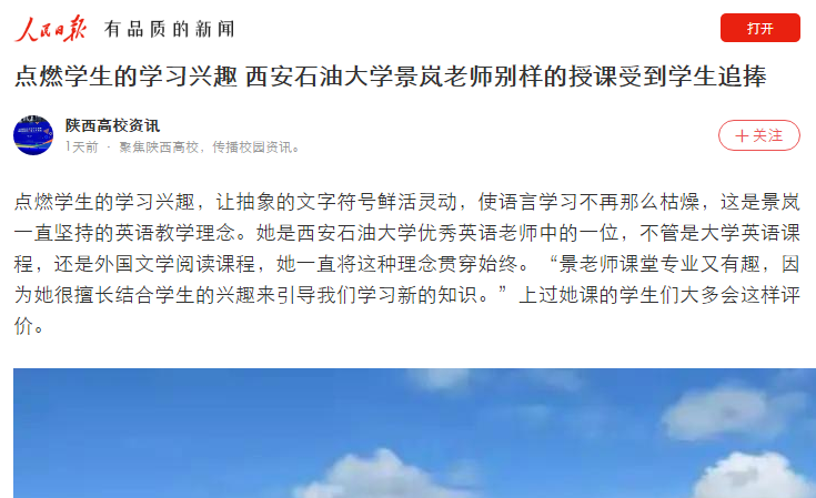 景嵐的努力學(xué)生們看在眼里記在心里。學(xué)生們常常會被她認(rèn)真的準(zhǔn)備和精彩的講解而感動。她的學(xué)生邱冬說:“景老師會耐心帶領(lǐng)我們學(xué)習(xí)課文的背景知識,拓寬我們的知識面。我知道,這一定需要她花費很多時間和精力備課。我要為景老師的認(rèn)真負(fù)責(zé)點贊!”