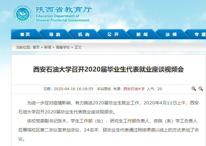 【省教育廳】西安石油大學(xué)召開2020屆畢業(yè)生代表就業(yè)座談視頻會