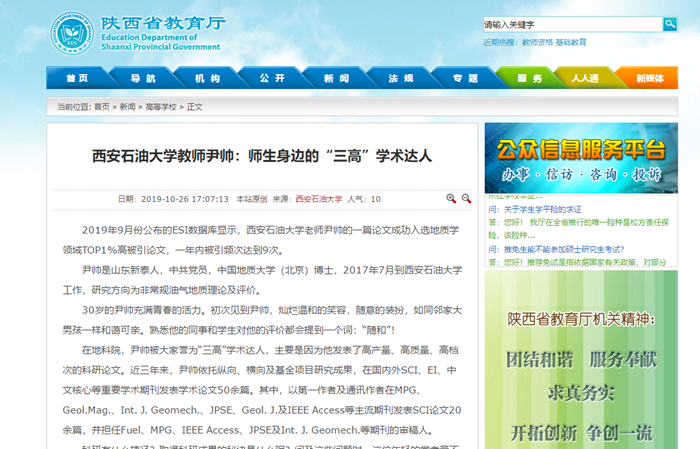 2019年9月份公布的ESI數(shù)據(jù)庫顯示,西安石油大學(xué)老師尹帥的一篇論文成功入選地質(zhì)學(xué)領(lǐng)域TOP1%高被引論文,一年內(nèi)被引頻次達到9次。