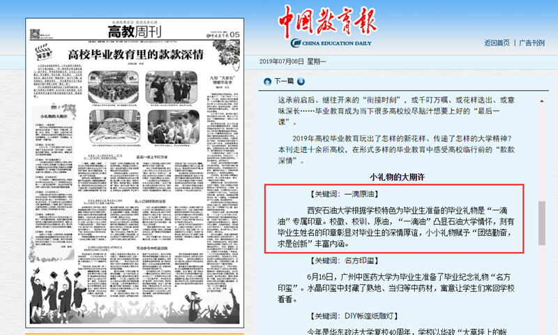 7月8日,《中國教育報》高教周刊的文章《高校畢業(yè)教育里的款款深情》,對我校的畢業(yè)禮物“一滴油”印章進(jìn)行了報道。文章寫到,西安石油大學(xué)根據(jù)學(xué)校特色為畢業(yè)生準(zhǔn)備的畢業(yè)禮物是“一滴油”專屬印章。?;?、校訓(xùn)、原油,“一滴油”凸顯石油大學(xué)情懷,刻有畢業(yè)生姓名的印章彰顯對畢業(yè)生的深情厚誼,小小禮物賦予“團(tuán)結(jié)勤奮,求是創(chuàng)新”豐富內(nèi)涵。