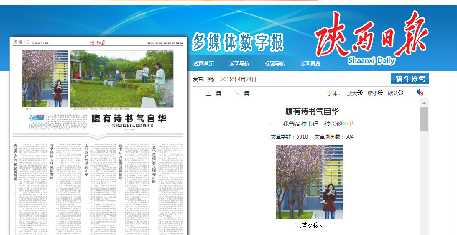 4月24日,《陜西日報》第10版“閱讀”專版刊發(fā)了兩張我校大學(xué)生孜孜不倦、專心讀書的照片。多年來,我校大力開展“書香校園”建設(shè)系列活動,同學(xué)們自覺將讀書作為一種生活方式和精神追求,用讀書充實人生,讓書香飄溢校園。