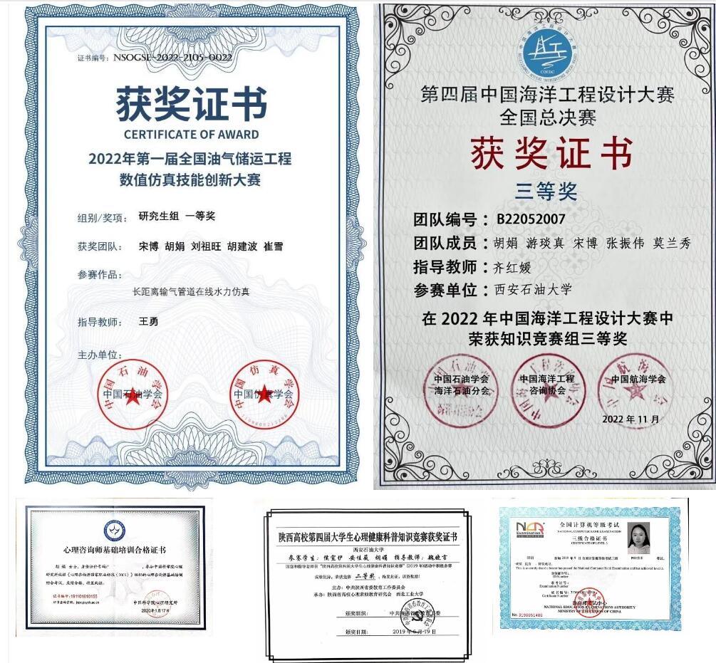 研究生期間,曾獲一等學(xué)業(yè)獎學(xué)金,被評為優(yōu)秀黨員、陜西省自強之星標(biāo)兵。曾獲第一屆全國油氣儲運工程數(shù)值仿真技能創(chuàng)新大賽研究生組一等獎、第四屆中國海洋工程設(shè)計大賽全國總決賽知識競賽組三等獎等獎項。