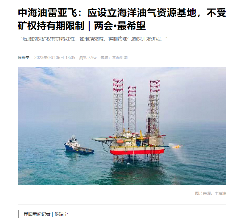 2 界面新聞:中海油雷亞飛:應(yīng)設(shè)立海洋油氣資源基地,不受礦權(quán)持有期限制