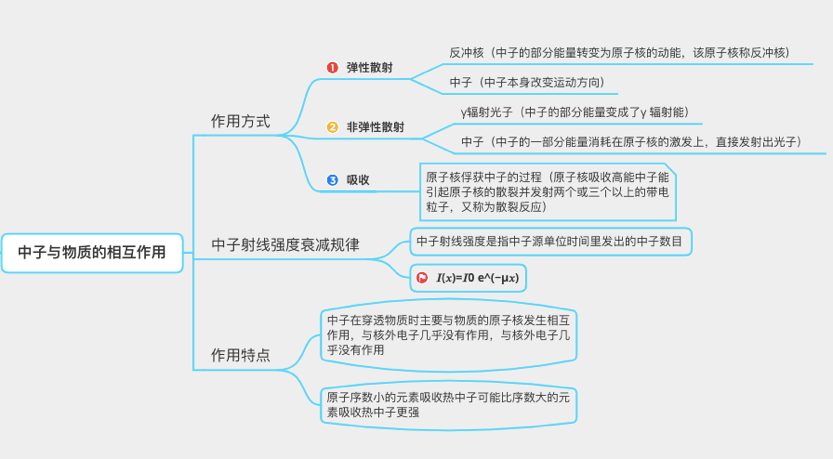 在特殊的教學(xué)環(huán)境下,如何得到學(xué)生學(xué)習(xí)成果的及時(shí)反饋尤為重要。在線上授課過(guò)程中,呂老師結(jié)合思維導(dǎo)圖教學(xué)理念,利用層級(jí)折疊式文字來(lái)整理內(nèi)容的大綱文檔工具,使學(xué)生用更高效的方式和更清晰的結(jié)構(gòu)來(lái)記錄學(xué)習(xí)筆記,在授課過(guò)程中采用Xmind等工具生成教學(xué)及學(xué)習(xí)思維導(dǎo)圖。思維導(dǎo)圖學(xué)習(xí)法是在西方中小學(xué)教學(xué)中常見的一種學(xué)習(xí)策略,也被公認(rèn)為認(rèn)知與學(xué)習(xí)、反思與創(chuàng)新的工具,利用思維導(dǎo)圖的可視化,促進(jìn)學(xué)習(xí)者靈感的產(chǎn)生和發(fā)散性思維的形成,在國(guó)外教育領(lǐng)域也廣泛作為優(yōu)化思維的工具,對(duì)教師的教和學(xué)生的學(xué)都有很大幫助。呂老師在日本攻讀博士學(xué)位期間,接受到“思維導(dǎo)圖”這一學(xué)習(xí)工具的教育和啟發(fā),將此學(xué)習(xí)法滲透到教學(xué)設(shè)計(jì)中,并在教學(xué)過(guò)程中引導(dǎo)學(xué)生對(duì)繪制思維導(dǎo)圖學(xué)習(xí)方法進(jìn)行研究和探索。疫情之下的線上教學(xué)中部分學(xué)生面臨沒(méi)有教材,在課堂上需要通過(guò)記錄聽課筆記的方式進(jìn)行學(xué)習(xí),呂老師引導(dǎo)學(xué)生在進(jìn)行課堂內(nèi)容消化吸收過(guò)程中采用思維導(dǎo)圖學(xué)習(xí)法進(jìn)行手繪或者利用思維導(dǎo)圖app進(jìn)行整理歸納知識(shí)點(diǎn),將每一堂課的內(nèi)容進(jìn)行關(guān)鍵概念和信息的整合,調(diào)動(dòng)全腦配合,根據(jù)個(gè)人的理解水平,連接關(guān)鍵詞充分記錄自己的思考和理解過(guò)程繪制課程思維導(dǎo)圖。一張圖畫,勝過(guò)千言萬(wàn)語(yǔ),呂老師通過(guò)學(xué)生提交的思維導(dǎo)圖可以得到學(xué)生對(duì)課程的理解掌握程度,一方面在對(duì)課堂內(nèi)容學(xué)習(xí)的過(guò)程中提升學(xué)生的歸納總結(jié)能力,將思維方式進(jìn)行可視化表達(dá)。另一方面可以反饋學(xué)生對(duì)授課內(nèi)容重難點(diǎn)的理解掌握程度,以便進(jìn)行教學(xué)方式進(jìn)度的改進(jìn)。以課程《無(wú)損檢測(cè)CIVA仿真技術(shù)》為例,在仿真技術(shù)學(xué)習(xí)之前,學(xué)生對(duì)射線與物質(zhì)的相互作用繪制思維導(dǎo)圖如下圖,以中子與物質(zhì)的相互作用為中心主題,向外發(fā)散輻射與中心主題相關(guān)的結(jié)構(gòu)和節(jié)點(diǎn),用鏈接的方式來(lái)調(diào)動(dòng)學(xué)生思考中心主題中子與物質(zhì)的相互作用輻射出三個(gè)相關(guān)概念(作用方式、中子射線強(qiáng)度衰減規(guī)律、作用特點(diǎn))。再以三個(gè)概念輻射出每一部分包含的內(nèi)容,以此類推得到中子與物質(zhì)的相互作用這一章節(jié)內(nèi)容的整體框架和邏輯。幫助學(xué)生發(fā)散思維、記憶和提高思考深度廣度,建立各種概念和知識(shí)點(diǎn)之間的層級(jí)聯(lián)系。